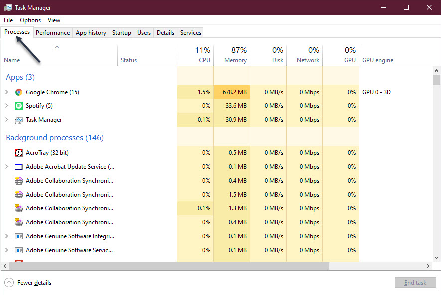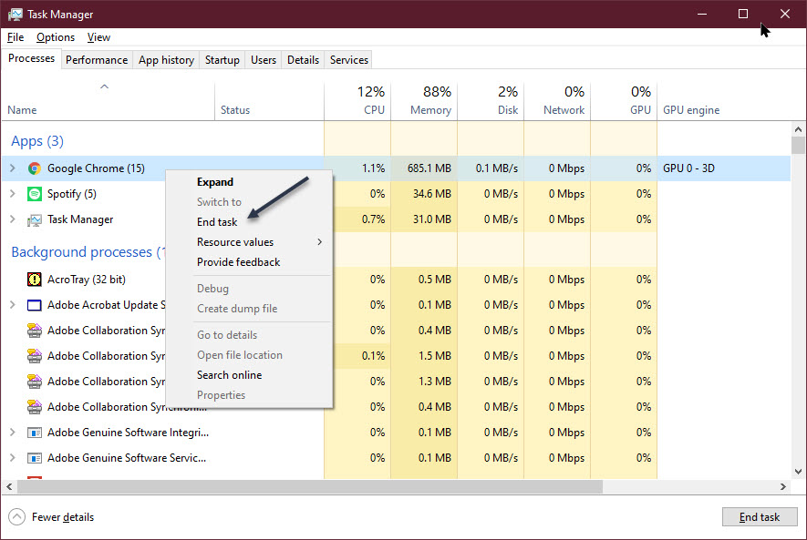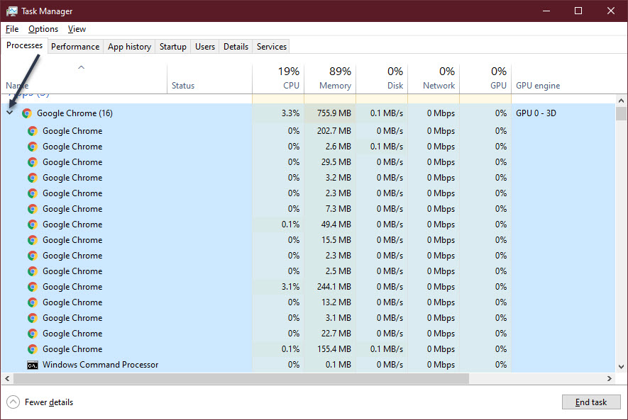 In our example, Google Chrome has a number at the end, number 15. This refers to the number of running Chrome instances. To see the detail, click its Expand arrow. If you use Chrome a lot, just ensure that the CPU percentage is very low; which means the Chrome task is “not overloading your system”. If it is, End Task as mentioned above. Refer to below image: