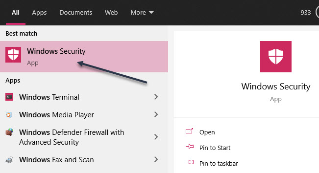On Windows 10, open your Start menu, type Windows Security in the Cortana search box. Now, click the Windows Security shortcut in upper left-hand corner to open it.