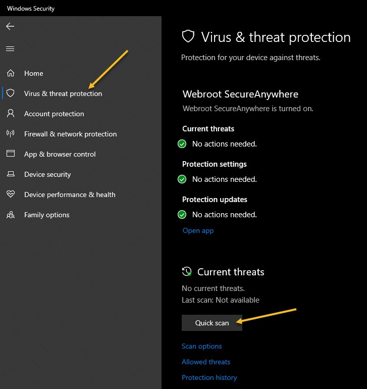 To perform an anti-malware scan, click Virus & threat protection in the sidebar. Now, click Quick Scan to scan your system for malware. If you do not see the Quick Scan option, ensure that Windows Defender is running. Windows Security will perform a scan and give you the results. If any malware is found, it will offer to remove it from your PC automatically. See following image: