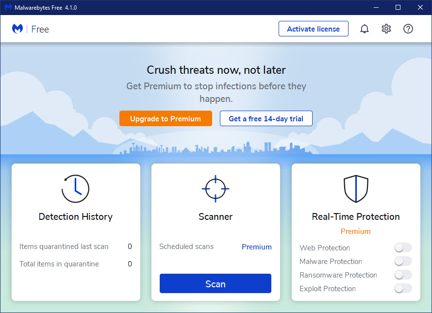 To download, click here. Then install and run. You may receive an Update Now screen. If so, just click the Update Now button and follow the instructions. Then, click the “free 14-day trial” button to run a scan. Refer to below image for the opening screen of Malwarebytes: