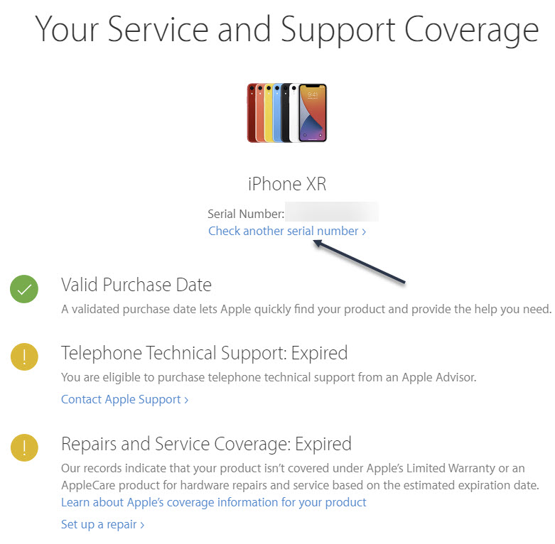 Also, you might want to check your other Apple devices. Just click the blue link labeled Check another serial number. Each device has its own Serial Number, which you would enter as mentioned above. Refer to below image: