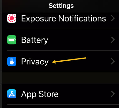 In the Settings menu, tap Privacy. See following image:
