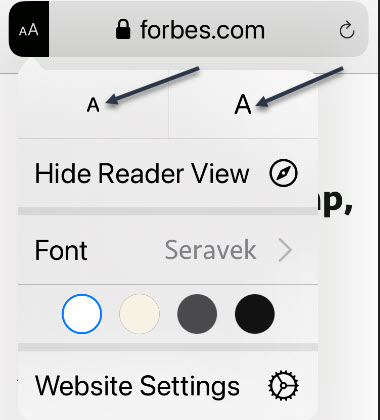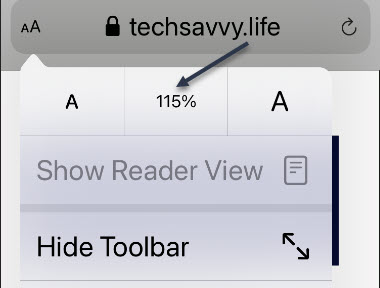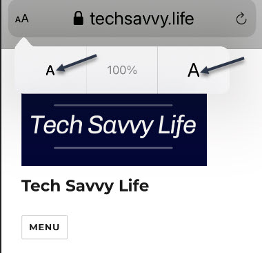 Next, tap the “aA” button again. From here, you can increase or decrease the text size. See following image: