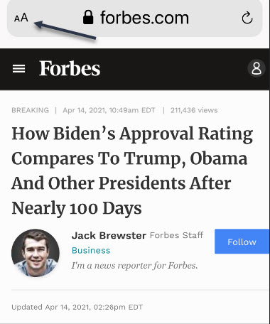 Now, after loading the page, tap and hold the “aA” button to enable the Reader View.