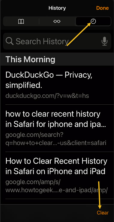 Next, in the pop-up that appears, tap the History tab (which looks like a clock face), and then tap the Clear button. See below image: