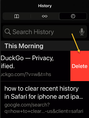 Also, you can delete individual entries by swiping to the left on them with your finger. When a red Delete button appears on the right, tap it. Refer to below image: