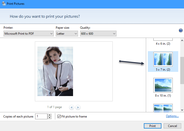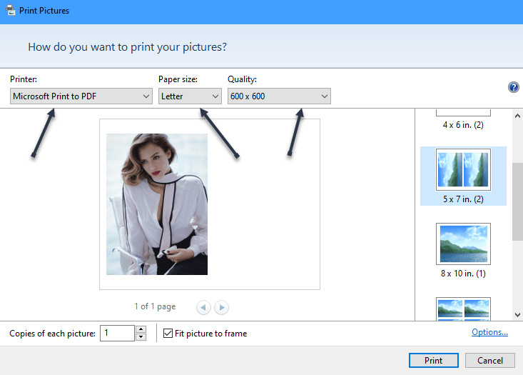 Next, at the bottom of the window, specify how many pages you want in your PDF using the Copies of Each option. To make your photo fit the PDF, enable the Fit Picture to Frame option. Click Print to start making your PDF file. Refer to the below image: