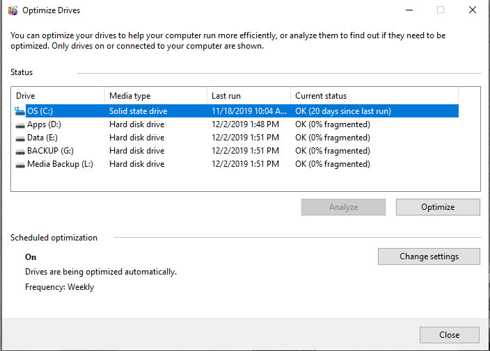 After Analysis is completed, if any drive shows greater than 10% fragmentation, I recommend you defrag the drive.