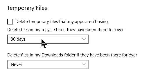 Under the Temporary Files section, the first option we want to enable is Delete temporary files that my apps aren’t using.